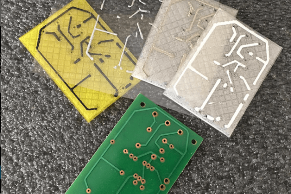 將混合電子 3D 打印用于 2D 打印應(yīng)用程序。在印刷電路板上用金色油墨打印。用銀漿打印互連。在玻璃上制作一個(gè)線(xiàn)性空間陣列,在卡普頓上打印線(xiàn)圈??赡苄允菬o(wú)限的。