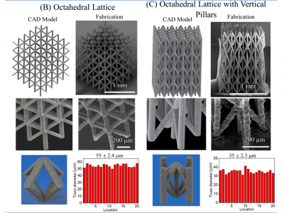 利用 Aerosol Jet 3D 納米顆粒成型技術(shù),制造新型高度復(fù)雜的3D 金屬微晶格材料,其具有: 直徑30–60μm,單位尺寸100 – 400μm 的近固態(tài)桁架構(gòu)件;設(shè)計了 3 種密度為大塊金屬 5% 至 26% 的晶格結(jié)構(gòu),以在壓縮載荷下通過彎曲和屈曲為主的機制變形